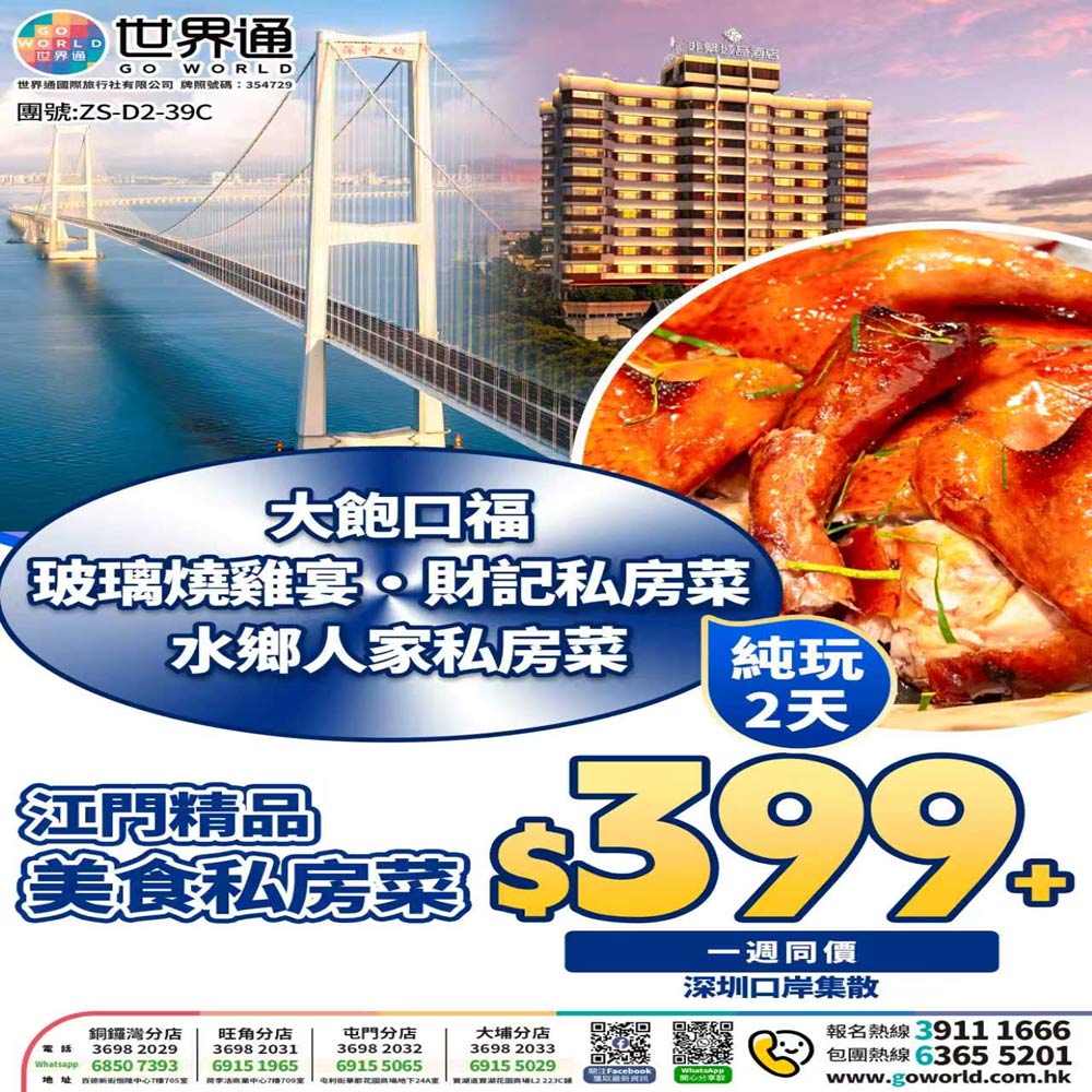「玻璃燒雞宴 + 財記私房菜 + 水鄉人家」江門美食 2 天純玩團