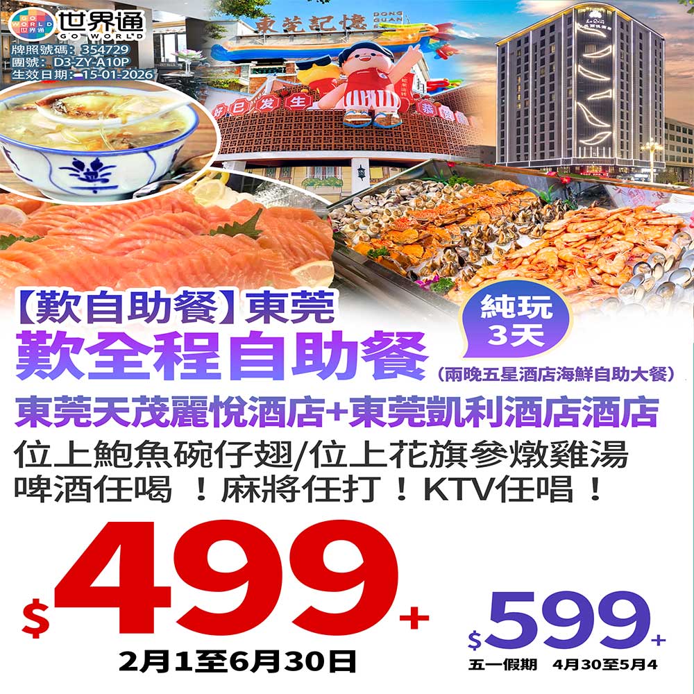 歎全程自助餐(兩晚五星酒店海鮮自助大餐),東莞天茂麗悅酒店+東莞凱利酒店酒店,位上鮑魚碗仔翅/位上花旗參燉雞湯,啤酒任喝!麻將任打!KTV任唱!