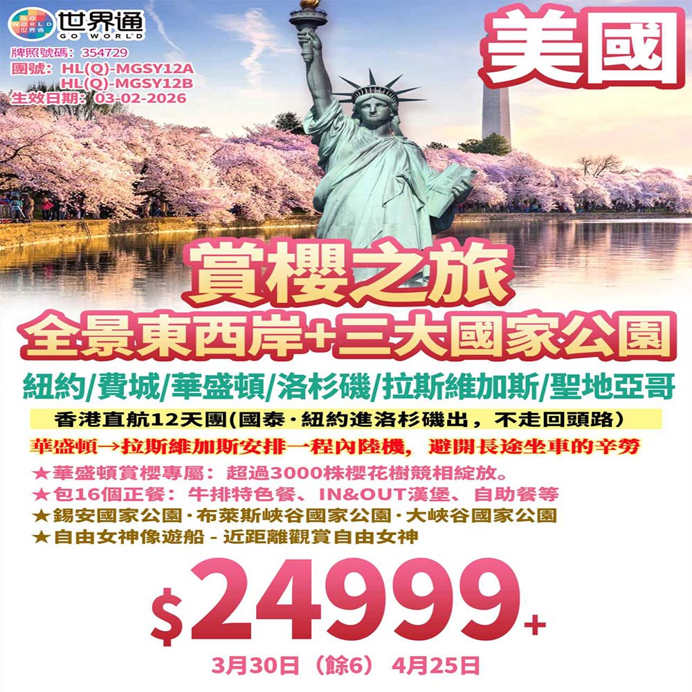 紐約/費城/華盛頓/洛杉磯/拉斯維加斯/聖地亞哥,香港直航省時,全程三星酒店舒適入住,美食相伴的悠閒跨國體驗